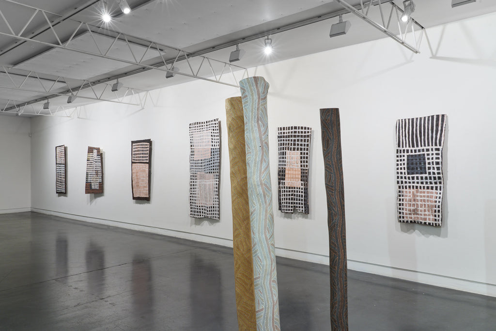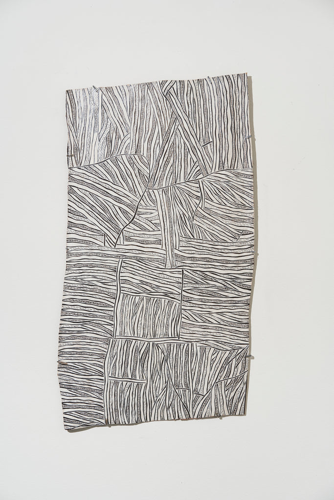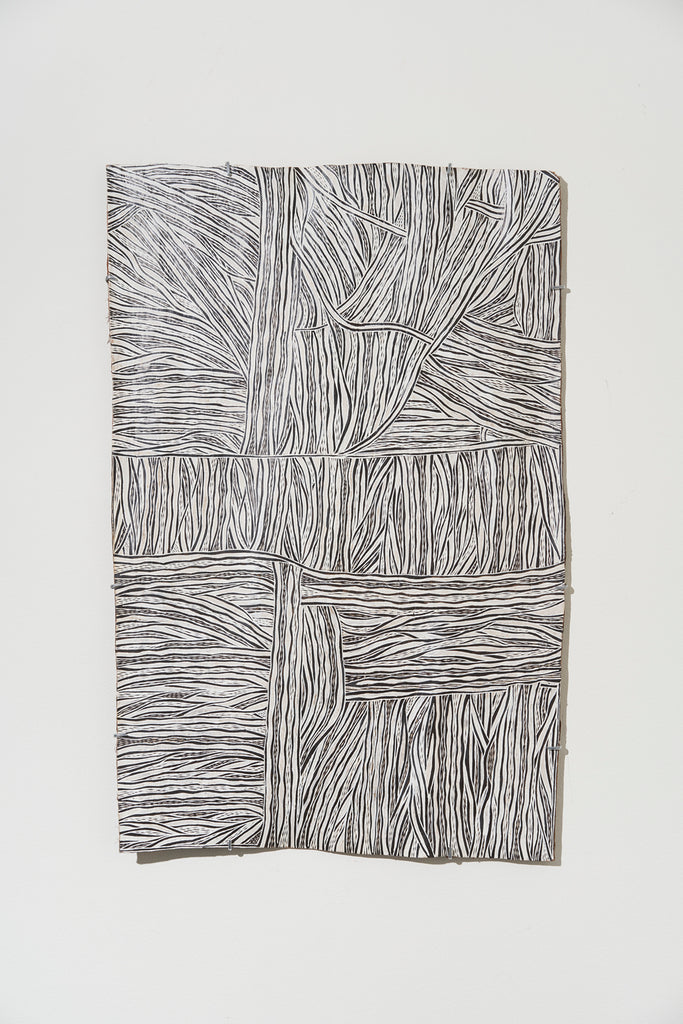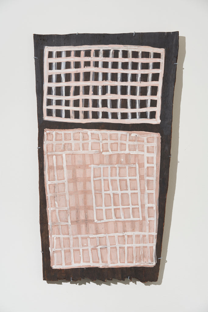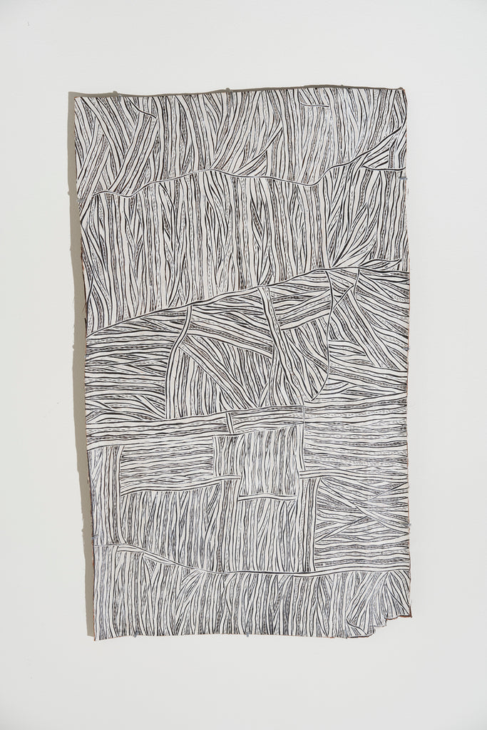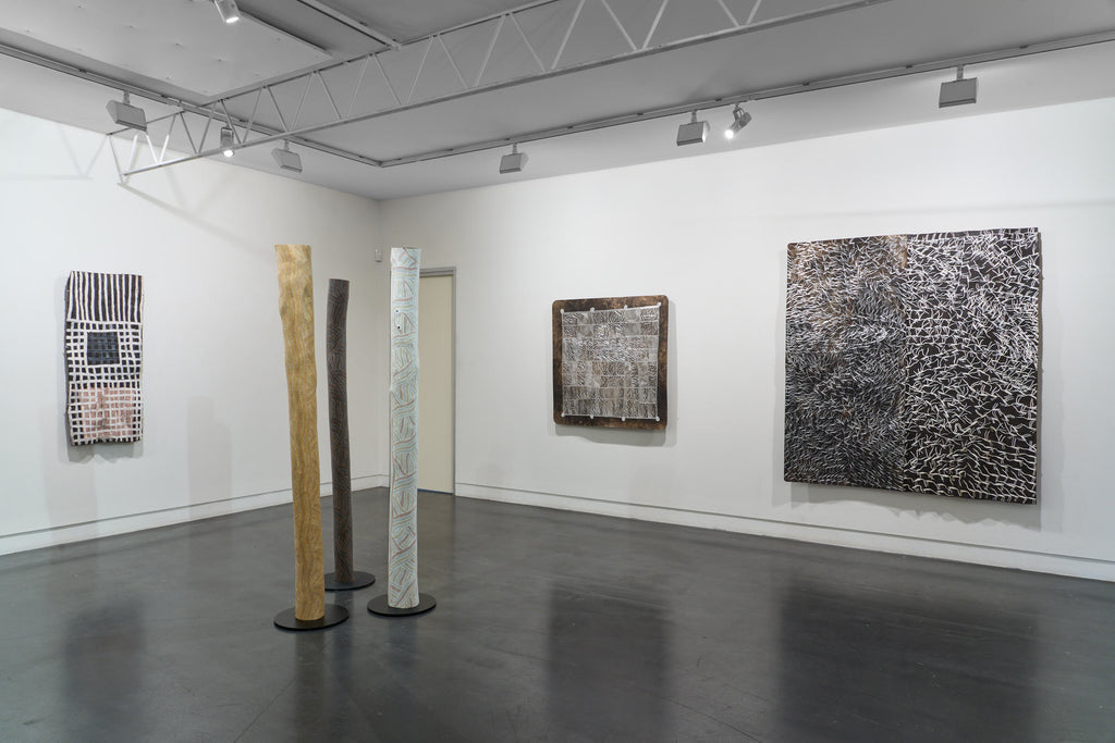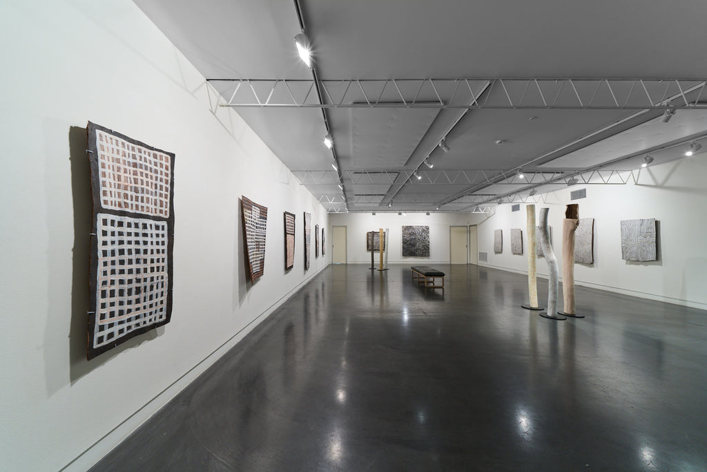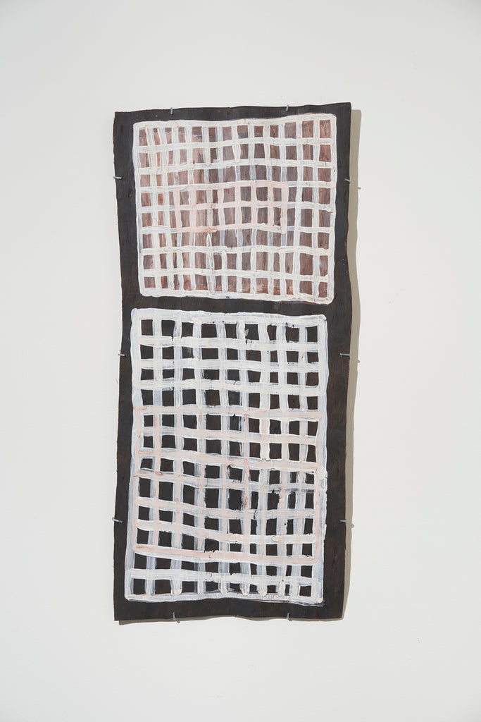 For some artists the landscape is not just a setting or a backdrop; it is a muse, a teacher, and a spiritual force. This is true of all the Yolŋu artists exhibited here. Staring out across an open plain or into a fecund jungle or along the crystalline coastline Yolŋu artists can see the invisible sacred design that represents that specific place. This is like a barcode that when scanned reveals the history, content and ownership of that wäŋa or place. Only those educated in the full identity of that country, and how to paint it, can dare emulate this pattern.