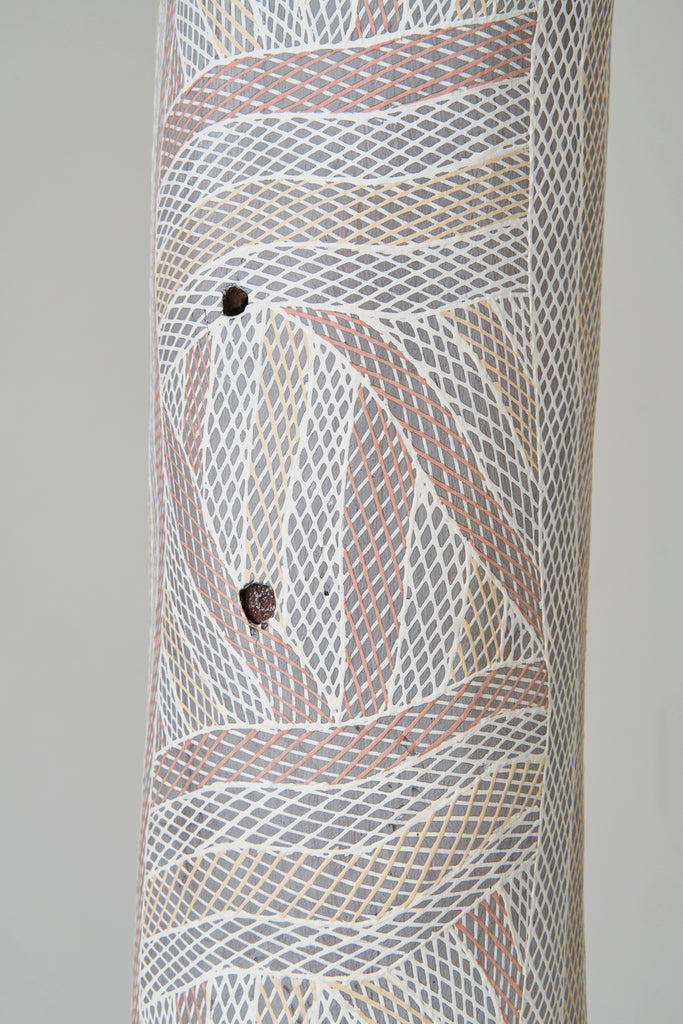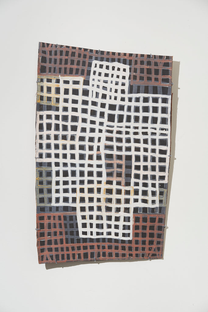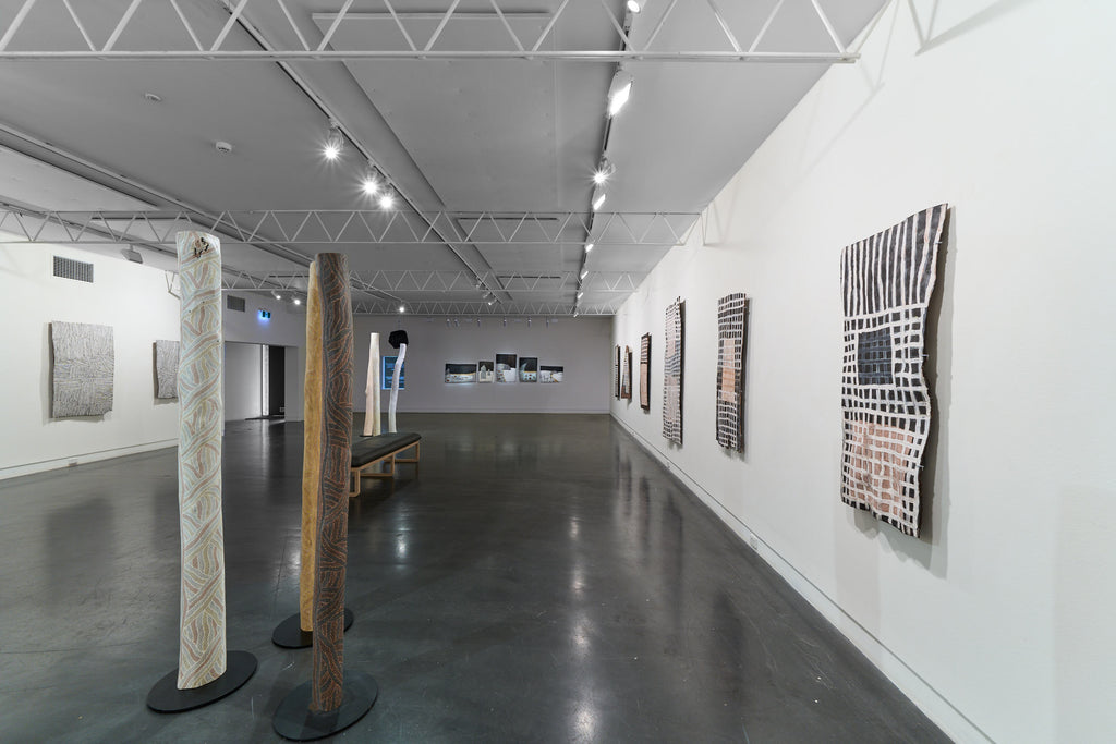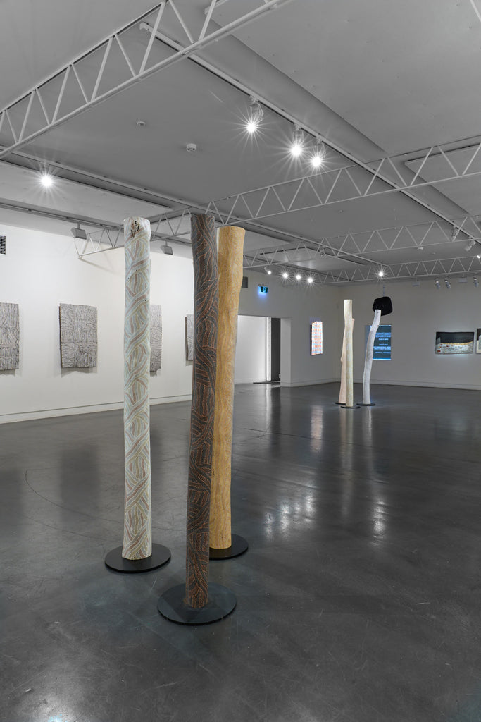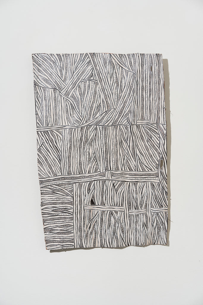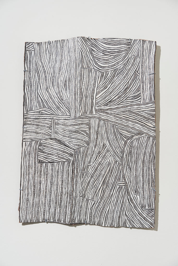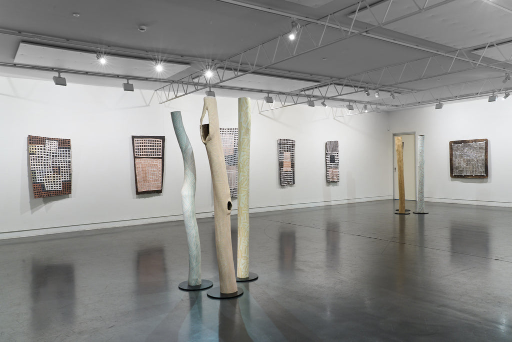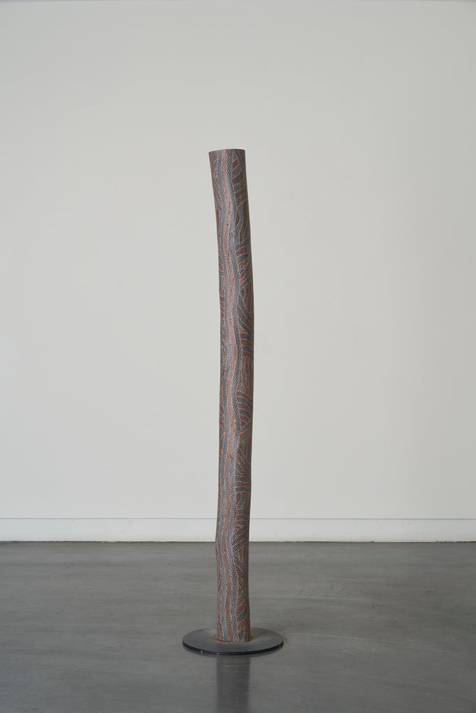 For some artists the landscape is not just a setting or a backdrop; it is a muse, a teacher, and a spiritual force. This is true of all the Yolŋu artists exhibited here. Staring out across an open plain or into a fecund jungle or along the crystalline coastline Yolŋu artists can see the invisible sacred design that represents that specific place. This is like a barcode that when scanned reveals the history, content and ownership of that wäŋa or place. Only those educated in the full identity of that country, and how to paint it, can dare emulate this pattern.