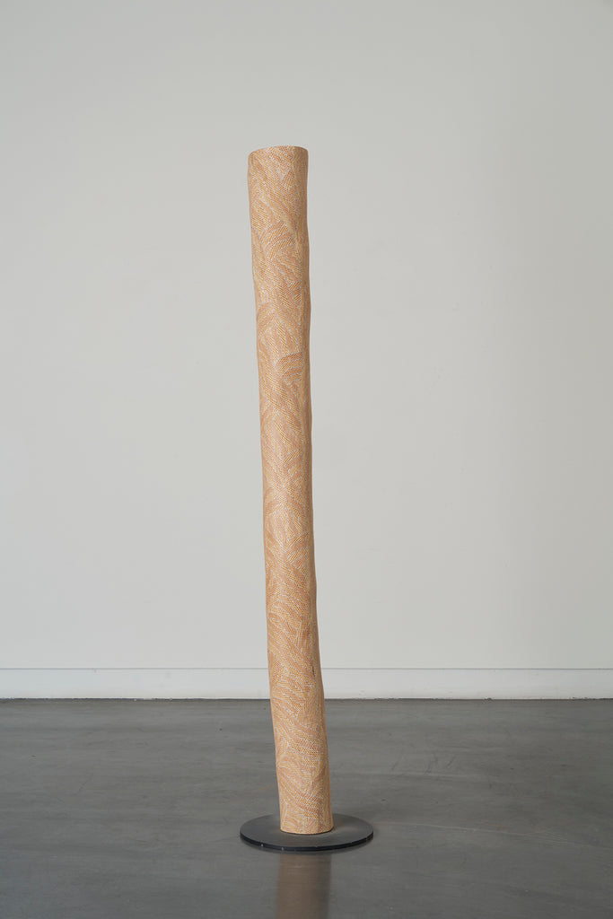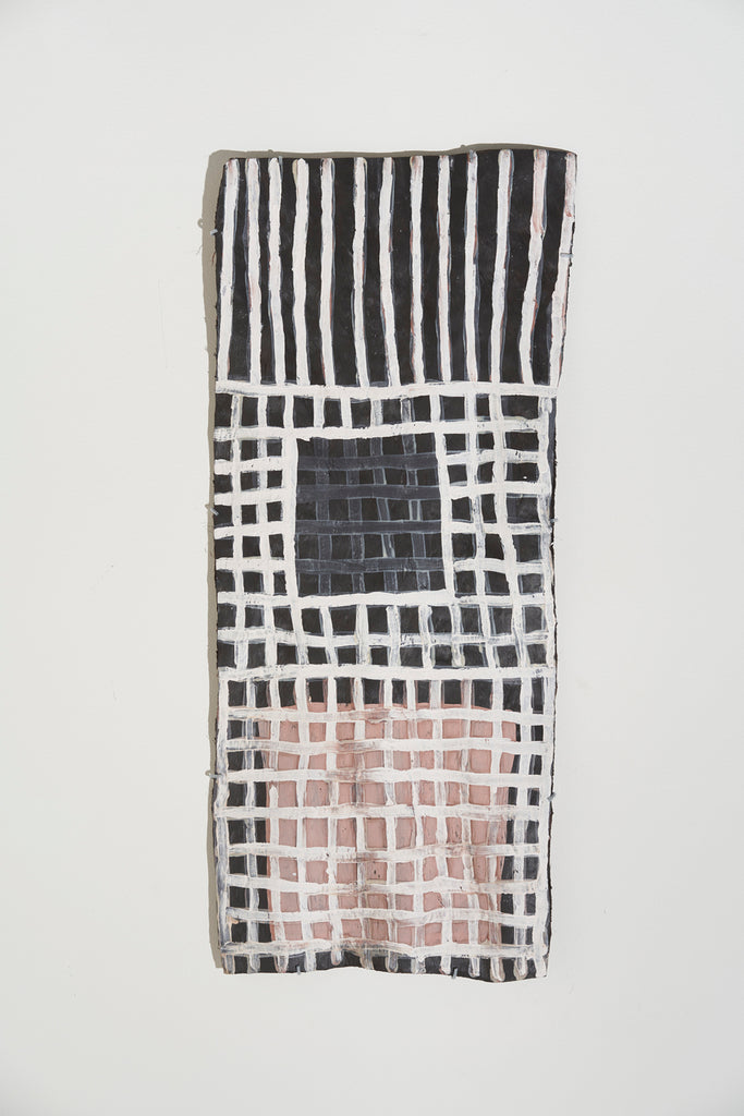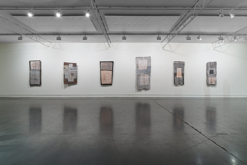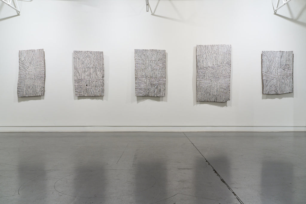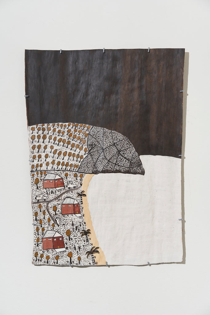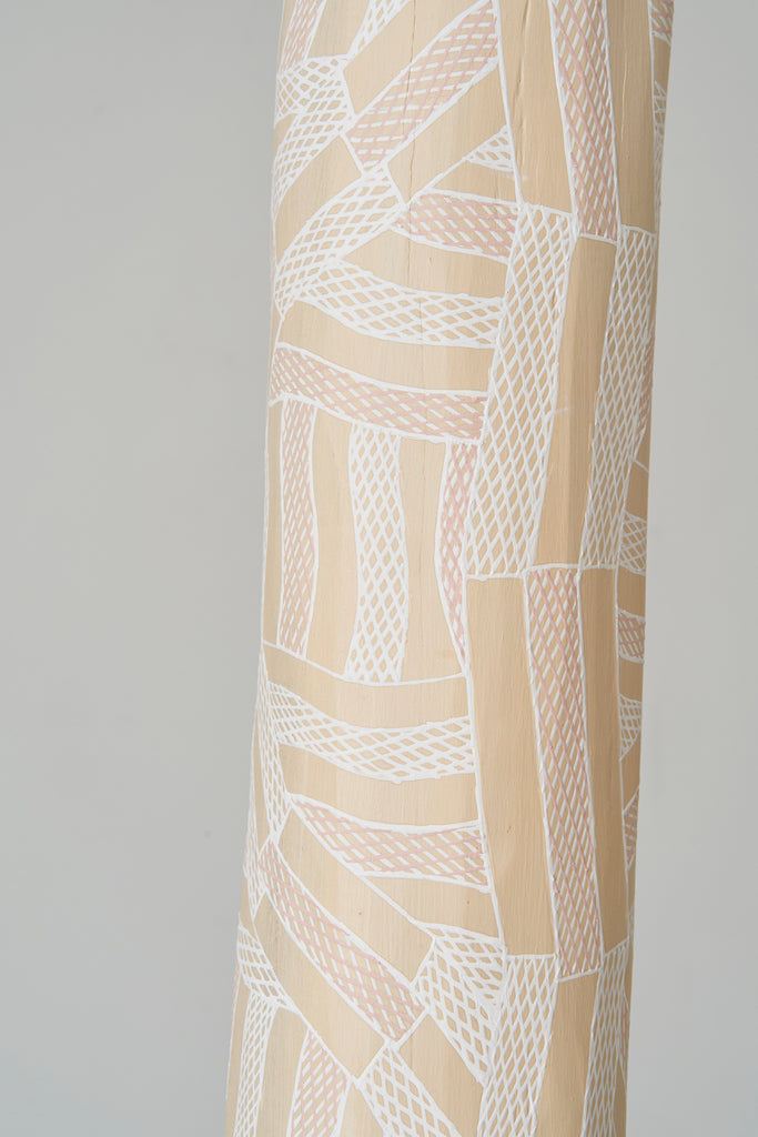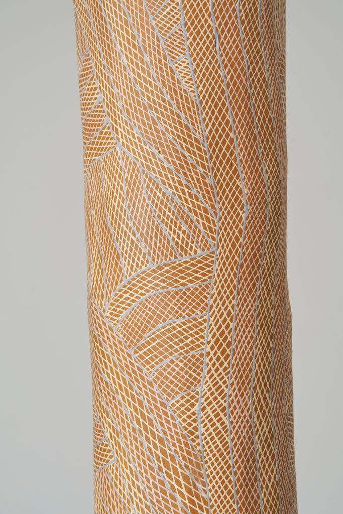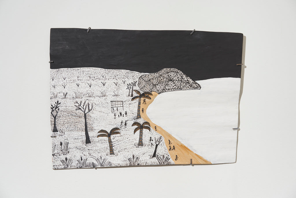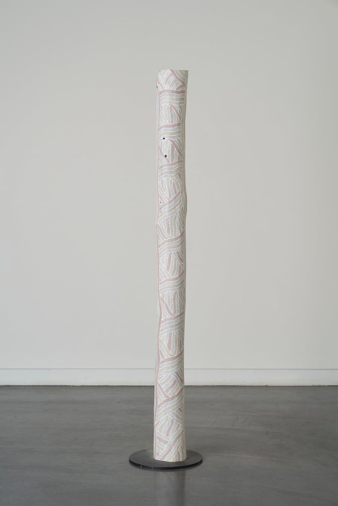 For some artists the landscape is not just a setting or a backdrop; it is a muse, a teacher, and a spiritual force. This is true of all the Yolŋu artists exhibited here. Staring out across an open plain or into a fecund jungle or along the crystalline coastline Yolŋu artists can see the invisible sacred design that represents that specific place. This is like a barcode that when scanned reveals the history, content and ownership of that wäŋa or place. Only those educated in the full identity of that country, and how to paint it, can dare emulate this pattern.