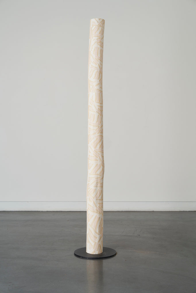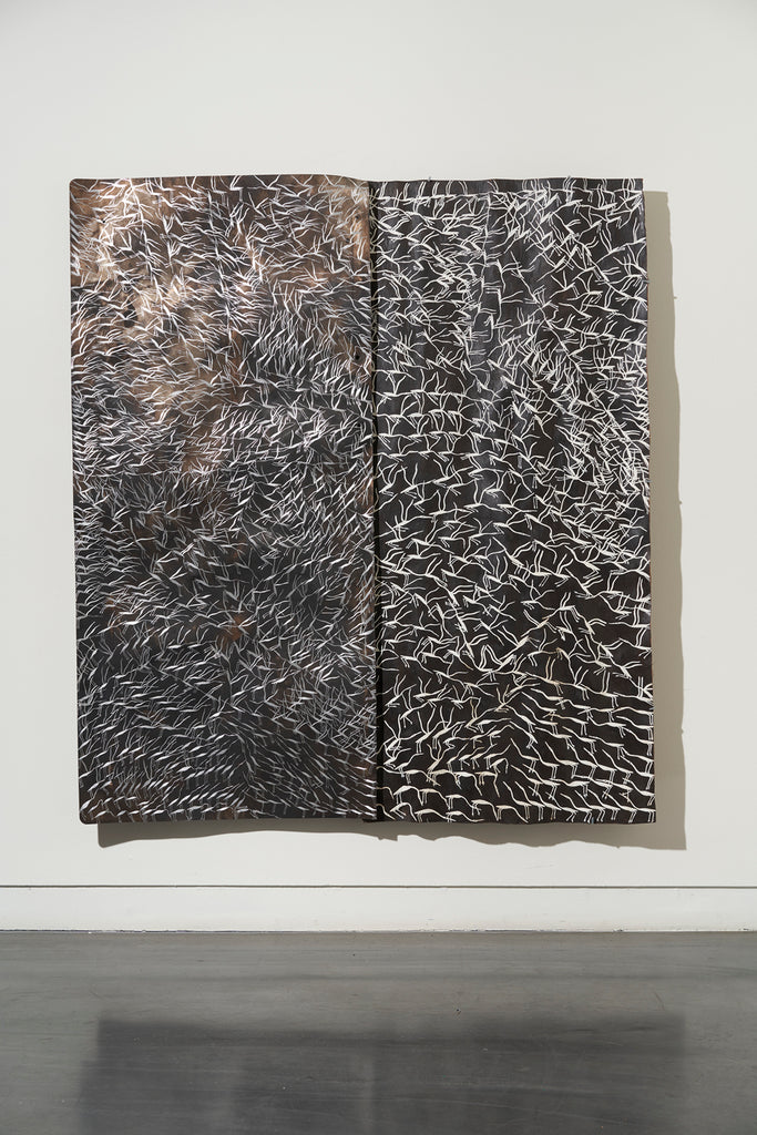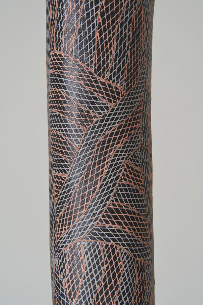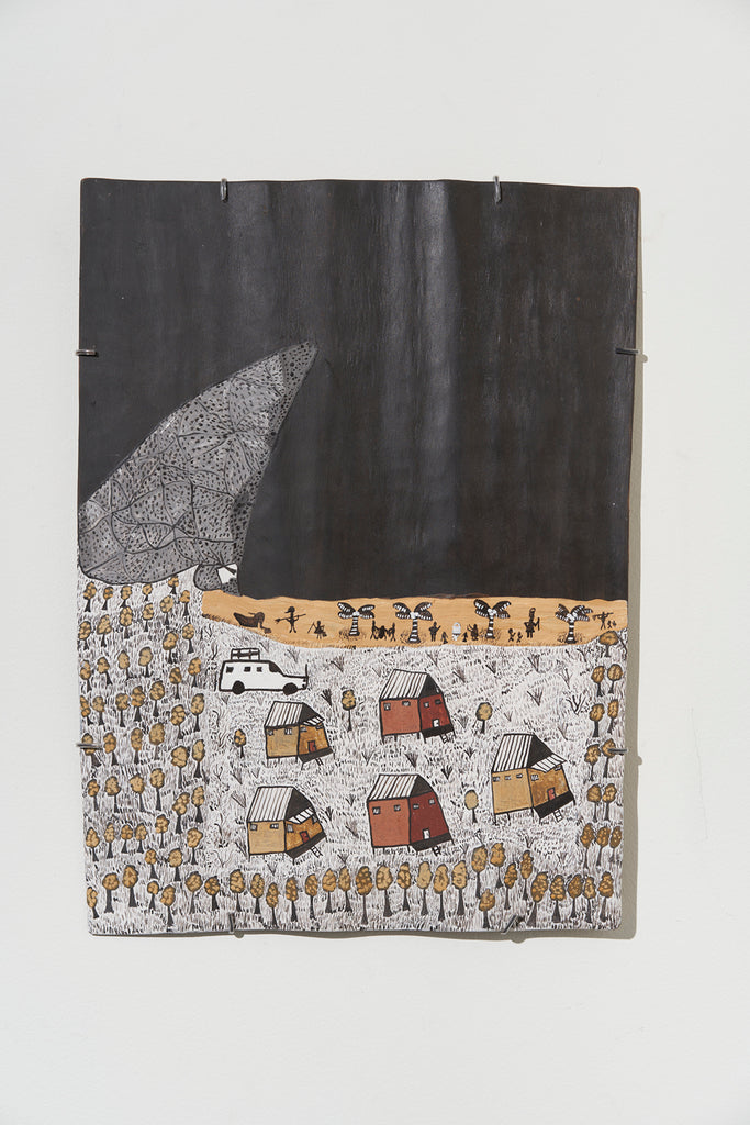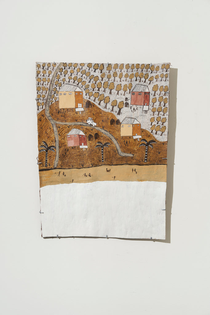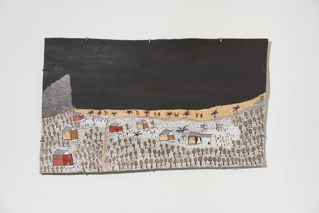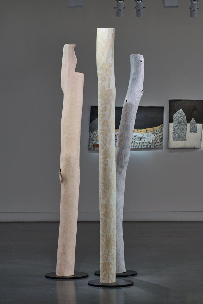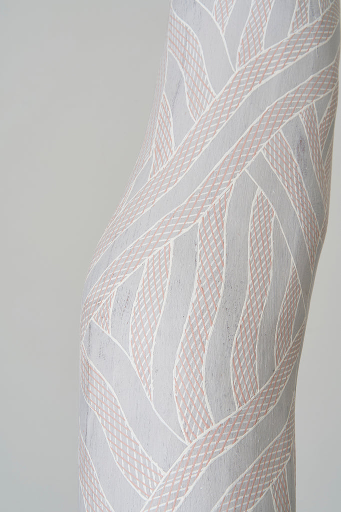 For some artists the landscape is not just a setting or a backdrop; it is a muse, a teacher, and a spiritual force. This is true of all the Yolŋu artists exhibited here. Staring out across an open plain or into a fecund jungle or along the crystalline coastline Yolŋu artists can see the invisible sacred design that represents that specific place. This is like a barcode that when scanned reveals the history, content and ownership of that wäŋa or place. Only those educated in the full identity of that country, and how to paint it, can dare emulate this pattern.