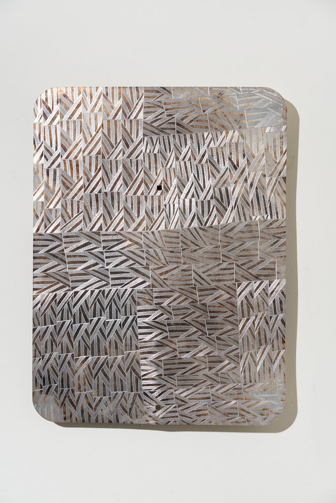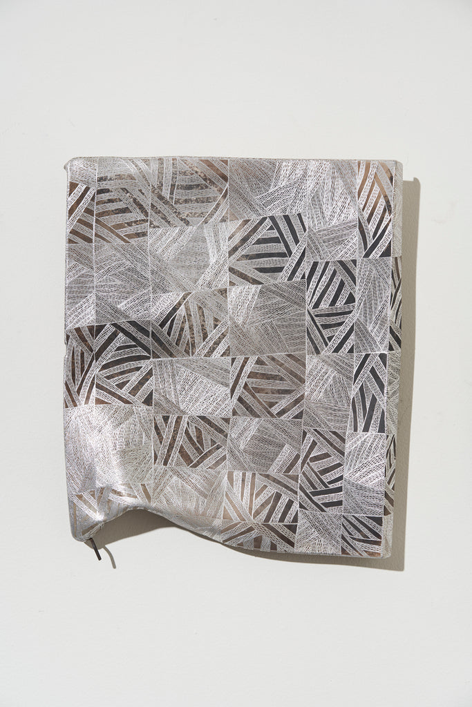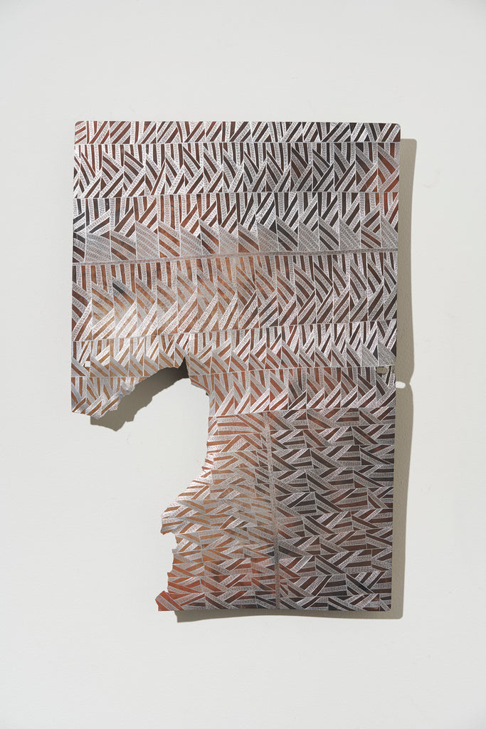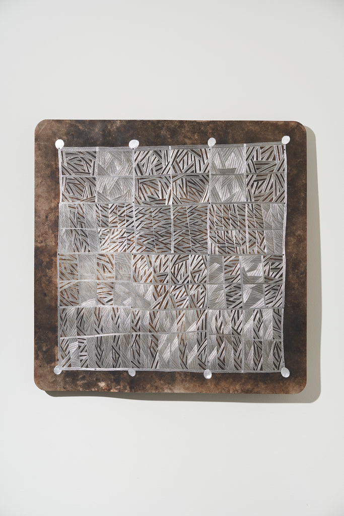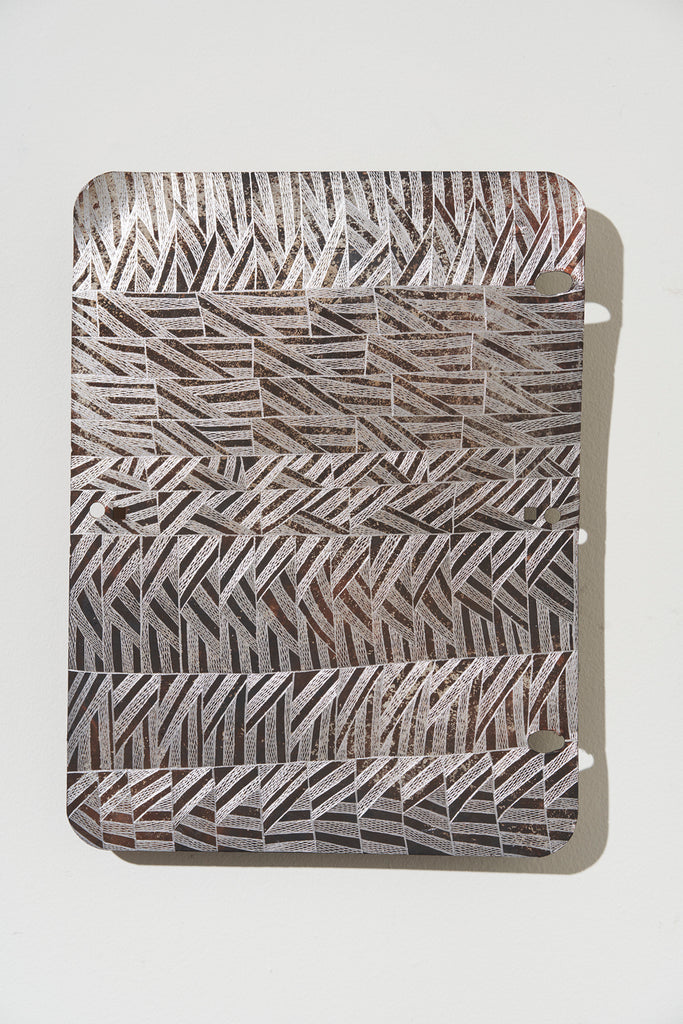 Marrnyula Munuŋgurr is a well established artist who has taken a different route- stripping back the design to its bare bones with minimal colour. Napunda Marawili has followed a similar approach in showing the turbulent, fire imbued coastal saltwaters of Yathikpa with a monochrome pallete. Manini Gumana has gone the opposite way adding more colours to the traditional four by combining and mixing the primary colours into pastel tones. Buku chairman Binygurr Wirrpanda draws on his muse of the billabongs of Dhuruputjpi adjacent to the endless floodplains of Yalata. But in this case he is using a rotary drill on abandoned road signage. According to Yolŋu protocols these discarded items are considered part of the land for this purpose.