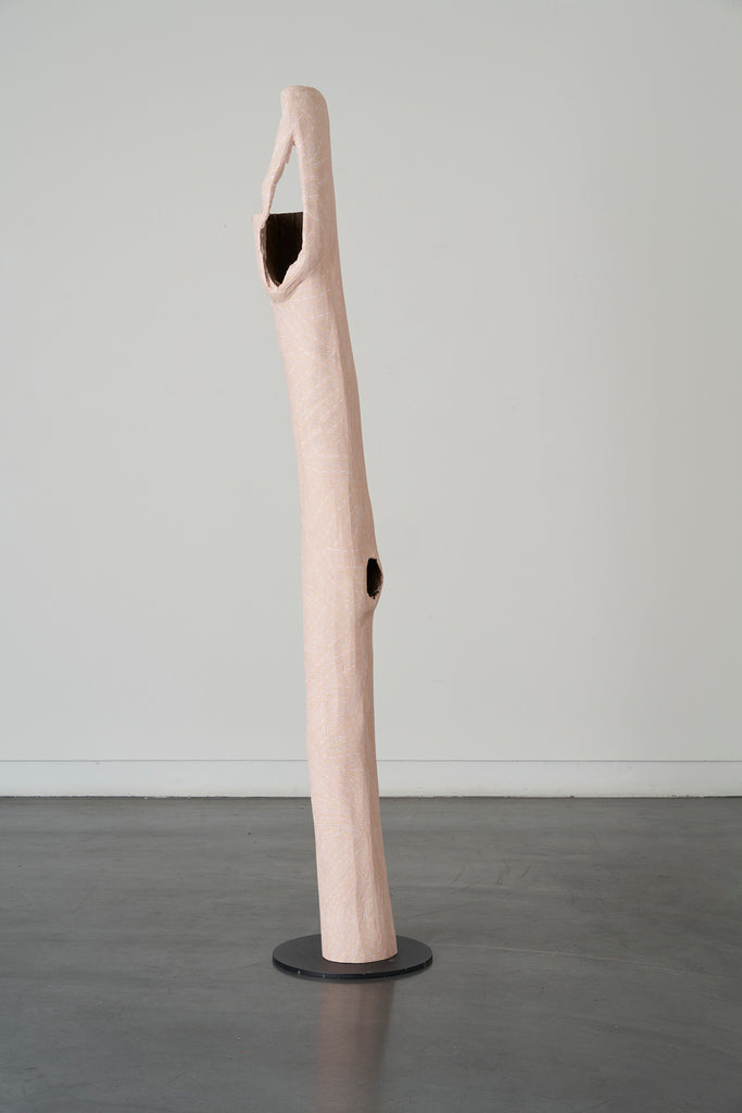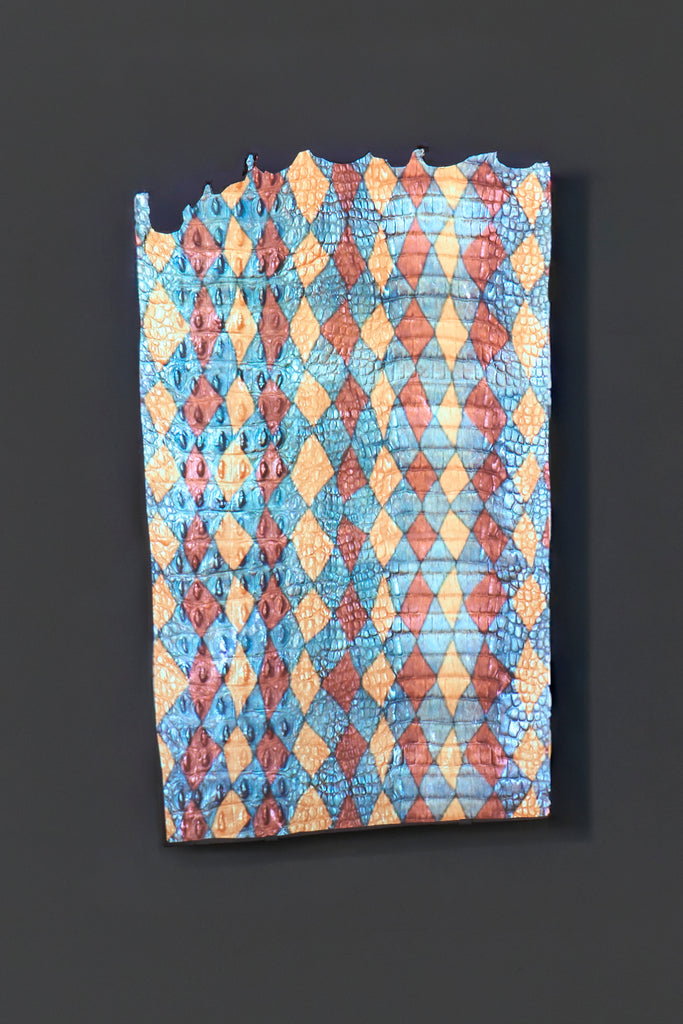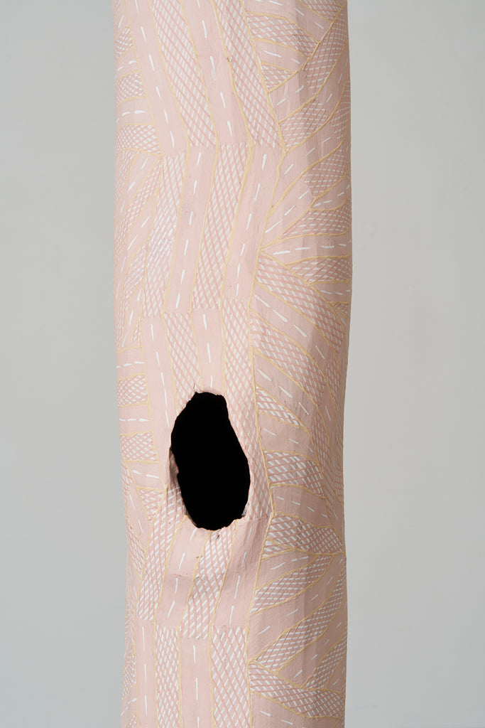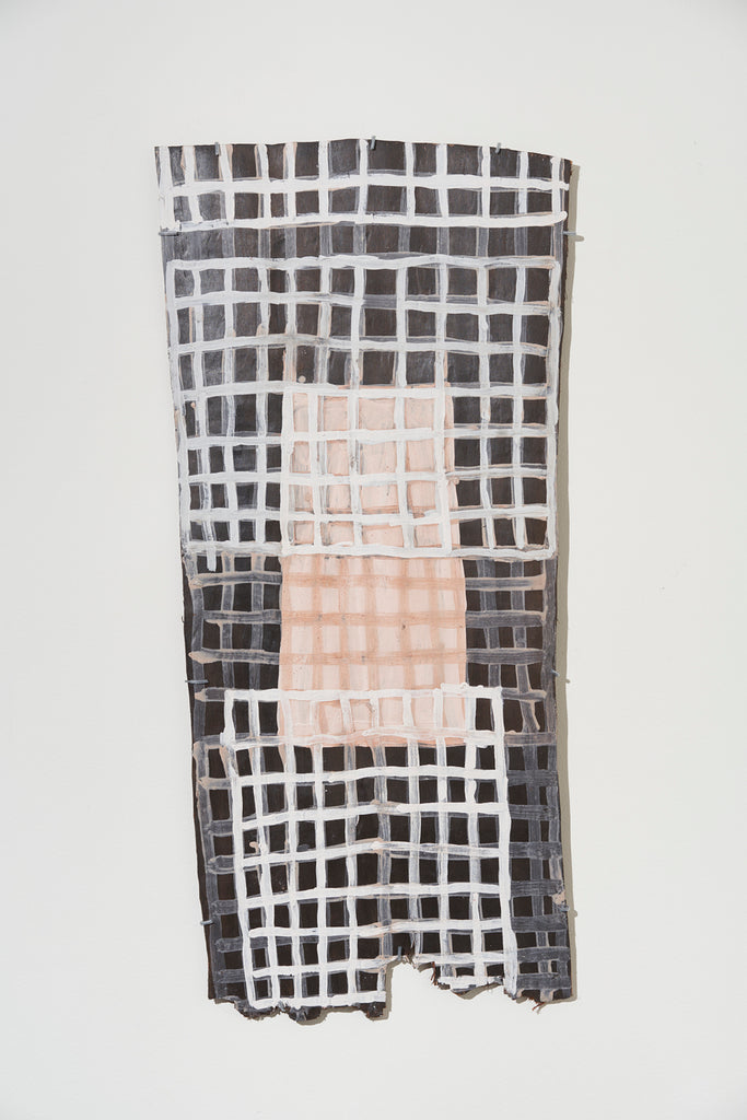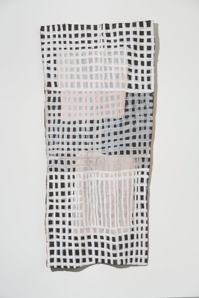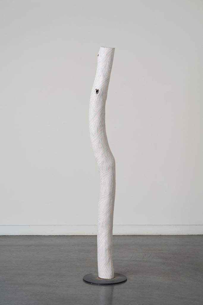 Marrnyula Munuŋgurr is a well established artist who has taken a different route- stripping back the design to its bare bones with minimal colour. Napunda Marawili has followed a similar approach in showing the turbulent, fire imbued coastal saltwaters of Yathikpa with a monochrome pallete. Manini Gumana has gone the opposite way adding more colours to the traditional four by combining and mixing the primary colours into pastel tones. Buku chairman Binygurr Wirrpanda draws on his muse of the billabongs of Dhuruputjpi adjacent to the endless floodplains of Yalata. But in this case he is using a rotary drill on abandoned road signage. According to Yolŋu protocols these discarded items are considered part of the land for this purpose.