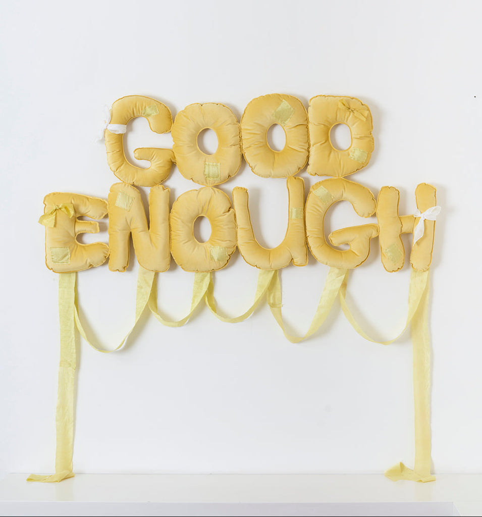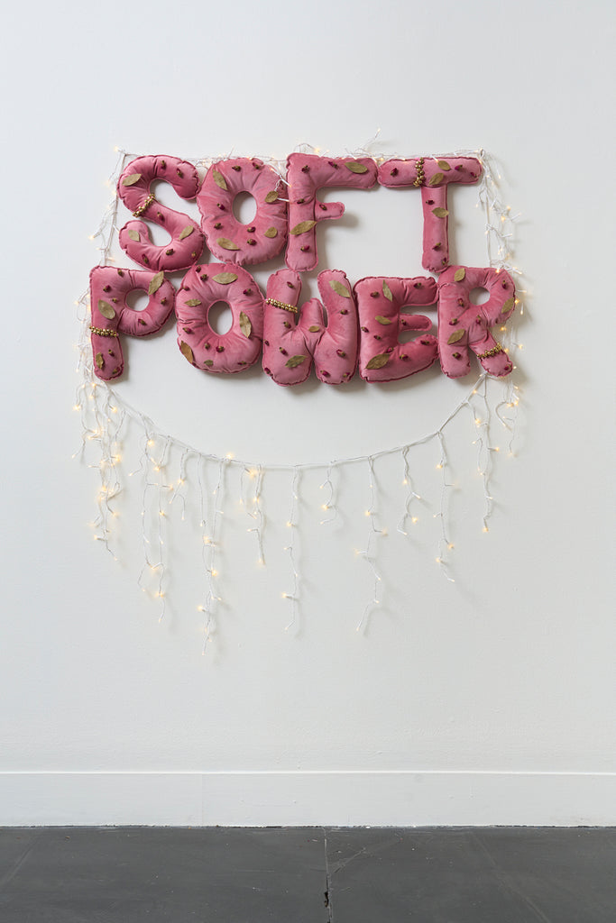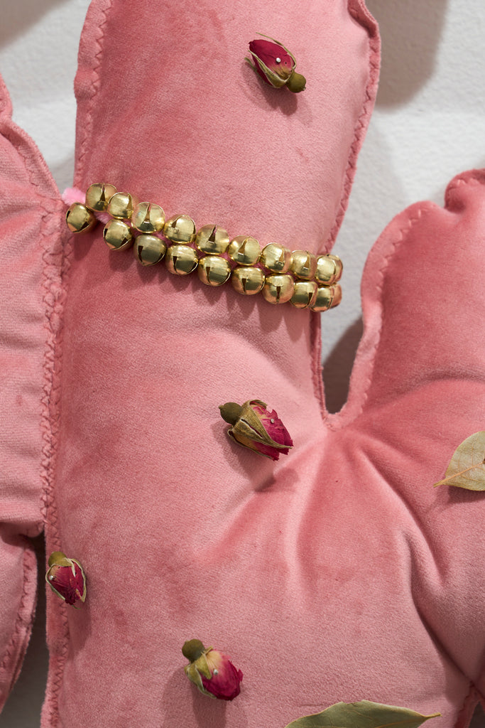 The exhibition also includes Things Observed In The Space Between Two Full Moons, a process work made from daily observation, and Helping To Keep Soft Power At the Forefront, a pink velvet text piece encircled with lights and adorned with bells, bay leaves, and dried rose buds, is an ongoing invocation.