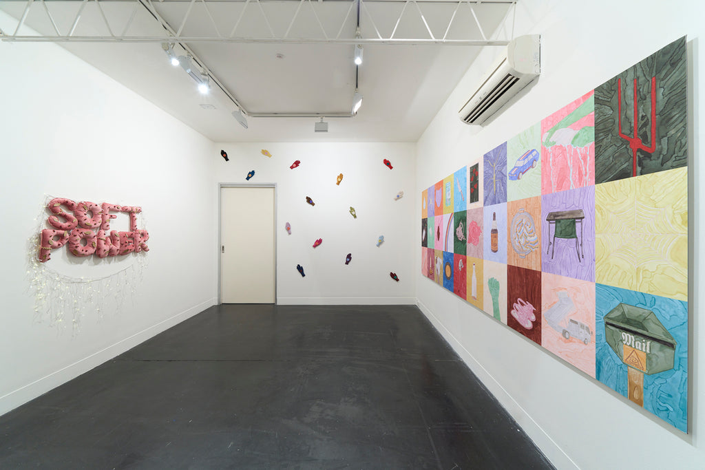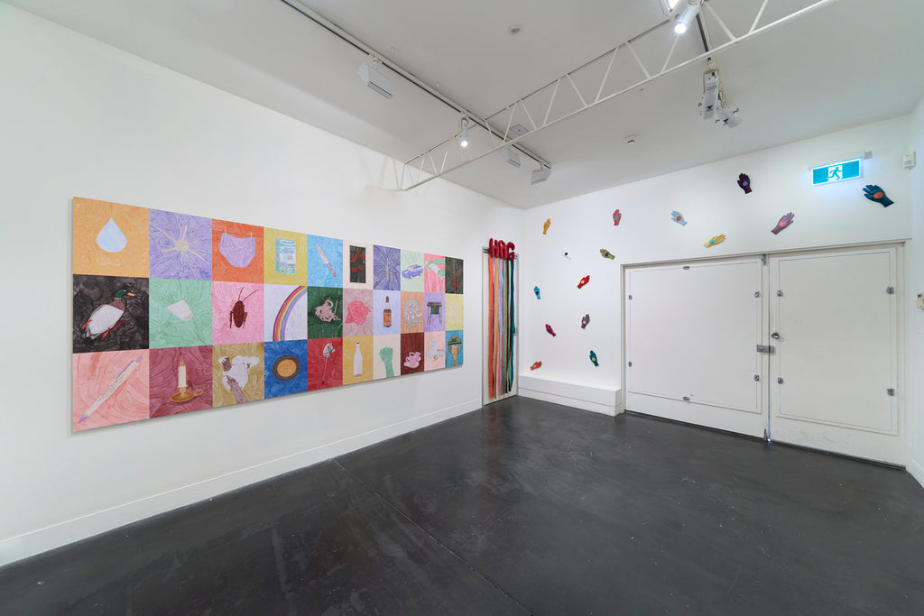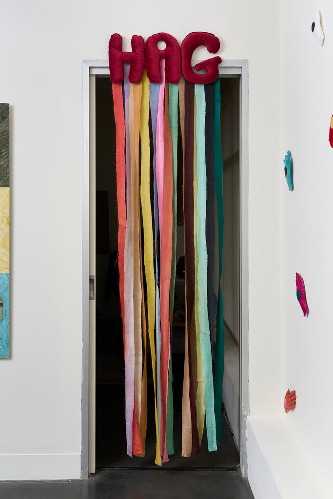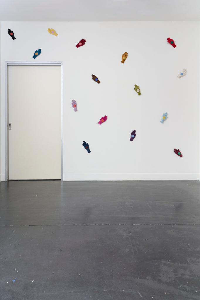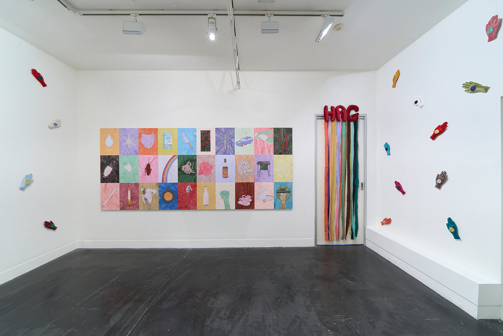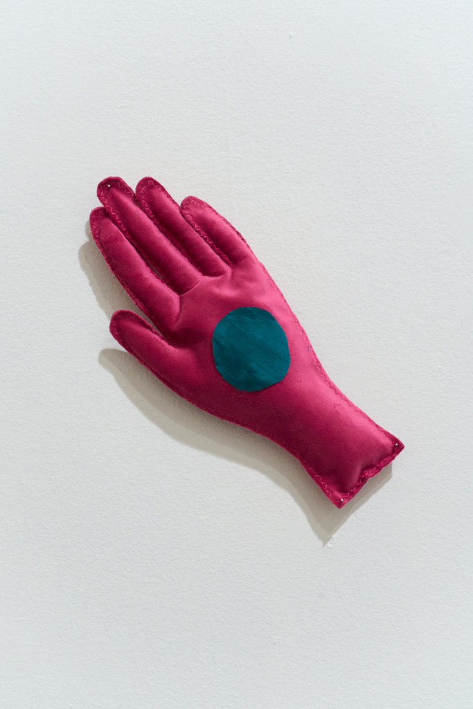 At its centre is Big Hag NRG, an installation of thirty velvet hands, the artists own, cut, stuffed, and stitched in various colours, each marked with a silk circle at its centre. Arranged on opposite walls, the hands resemble a giant reiki session: transmitting energy across the room, their charge activated by the artist prior to install. To enter the space, visitors pass through Lucky Hag (in the doorway), a velvet text work with cascading silk ribbons. Spritzed with four-leaf-clover water, the ribbons brush against the body so that all who cross the threshold are touched, and blessed, by the hag.