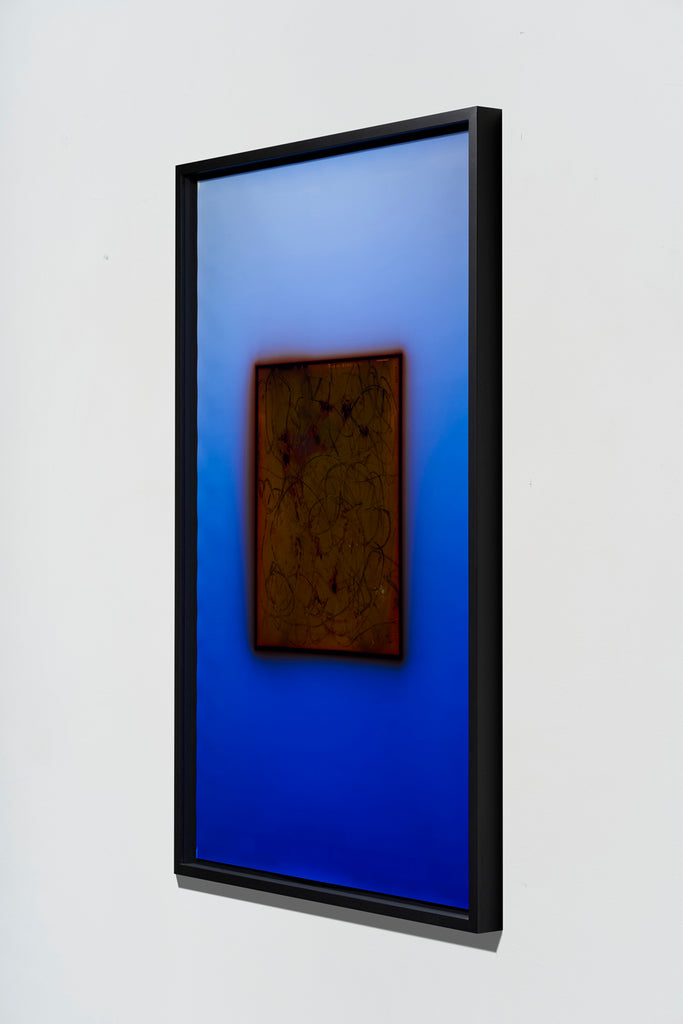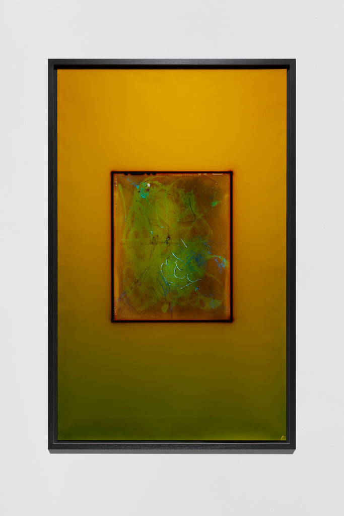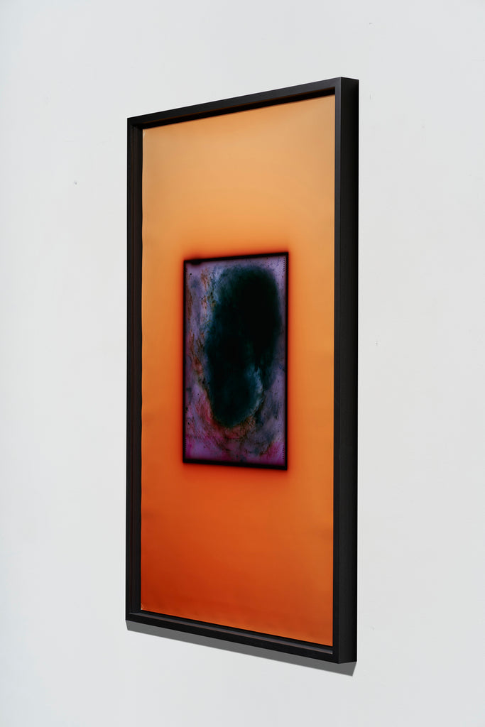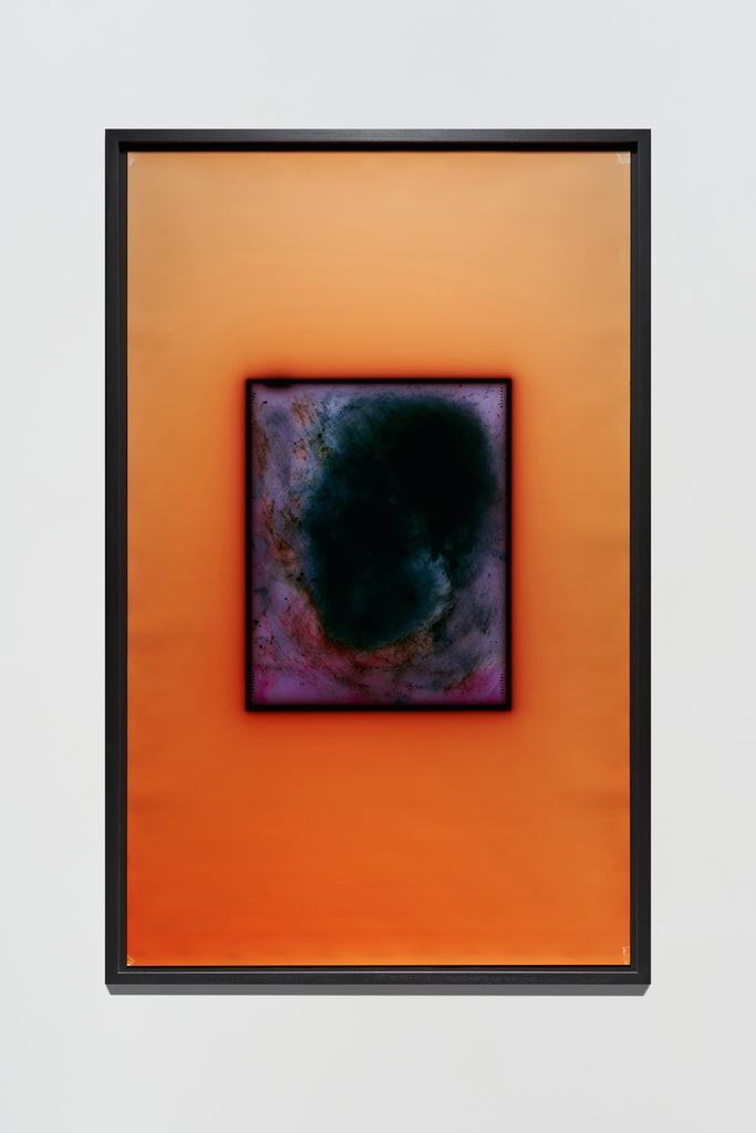 The artist’s performative engagement with photographic materials continues in the darkroom. Each print carries variations in colour, along with fingerprints and material traces bearing witness to Varga's emphatically subjective process. During printing, the negative rests between sheets of glass in an enlarger. The dark line framing the negative's edge results from light seeping through gaps in this equipment. Rather than cropping the surrounding field, Varga includes this expansive space, enhancing it with coloured light to make the negative's edge and the enlarger’s shadow essential compositional elements. The result invites viewers to reconsider what a photograph might be—not merely mechanical reproduction or transparent window, but physical object painstakingly crafted through chemical and creative forces.