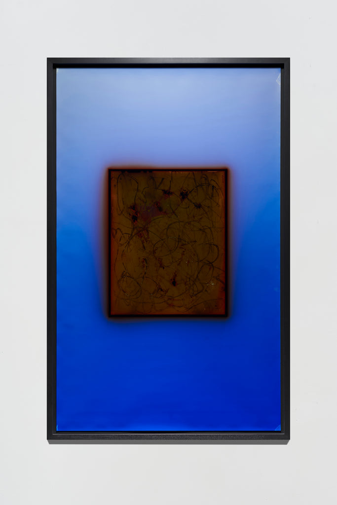 Scribble tests the limits of mark-making, photographic legibility, and the transmission of human knowledge. Its central image is an energetic bundle of calligraphic lines bounded by a dark rectangle seared into the surrounding blue field. Evoking gestural abstraction, Varga’s lines are scratched into the film's surface, in some places with such force that they penetrate and remove the underlying emulsion. The frustrated effort evident in this expressive act emphasizes the handwritten quality of the lines even as they refuse to resolve into recognizable language.