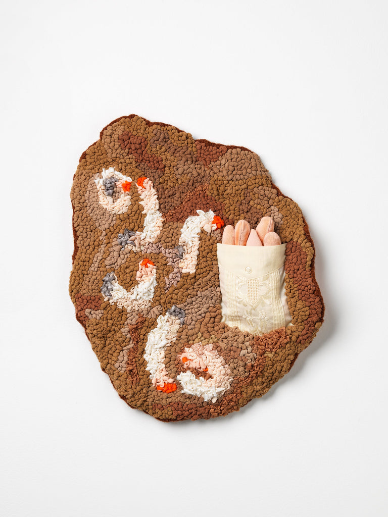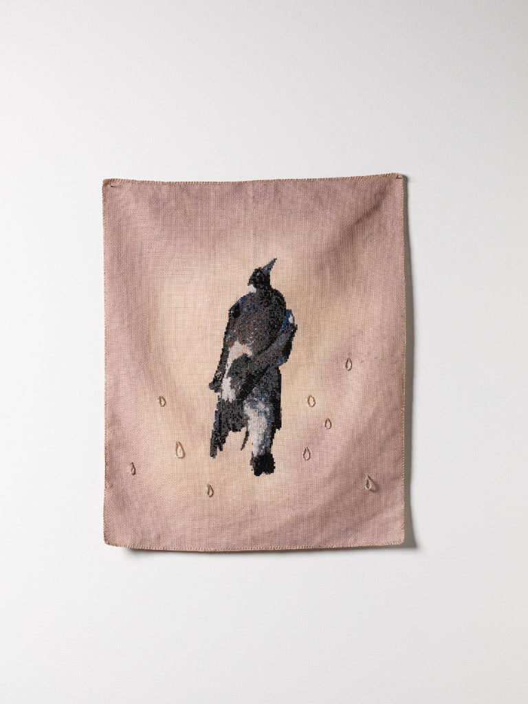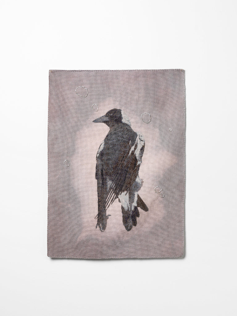 Since ancient times birds have been portents, returned lost souls, or harbingers to humans trying to navigate unknowns. Birds, as Delia Falconer writes in Signs and Wonders, are ‘recognised … instinctively as the emissaries of a deep past, much older than we are’ (p. 82): they did evolve from dinosaurs. In my life Magpies and their warblings are portals connecting to my matriarchal forebears, particularly my great-grandmother who found avian solace after her son’s drowning. This series specifically, turns to magpies as fleshy stand-ins for my lost mother, conjuring fading sentiments of companionship, safekeeping, grounded-ness, and sustaining traditions. With filled pockets, gloves, cloaks and coverings, these magpie-mothers occupy inside(s) and outsides, life and beyond. Despite grief, these are not spectral magpies but real-world embodiments of qualities which guide me, like they did my great-grandmother, of how to live amidst ongoing mourning and honour knowledges from deep pasts; birds and human.